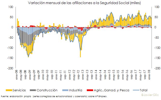El crecimiento del empleo, corregido por la estacionalidad y excluyendo el sector primario, lo cual permite comparar las cifras de forma homogénea, fue del 0,26% mensual, que, si bien es ligeramente inferior al del mes de febrero, constituye un buen dato. El menor aumento del empleo se produce tanto en los servicios -debido entre otros a un descenso en el empleo público- como en la industria, mientras que la construcción interrumpe una racha de dos años de crecimiento, con un parón en el segmento residencial, al tiempo que el volátil empleo de la agricultura desciende.