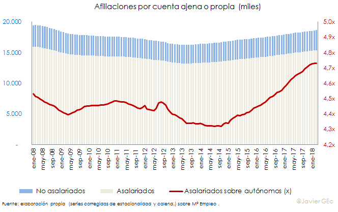 En perspectiva, se observa cómo la fase actual del crecimiento descansa más sobre el empleo asalariado que sobre el de los autónomos. Si en 2015 la relación era de 4,3 afiliaciones de cuenta ajena por una de cuenta propia, actualmente dicha relación es de 4,8.