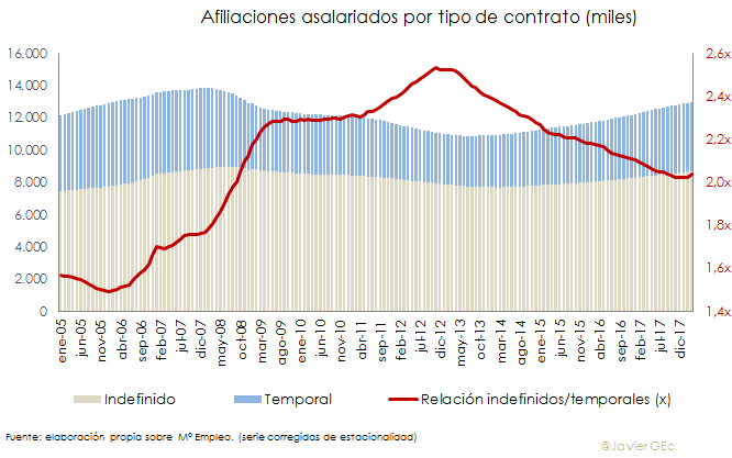 A su vez, dentro del empleo asalariado se observa un ligero repunte en 2018 de la contratación indefinida sobre la temporal, lo que, de confirmarse, rompería la tendencia desde el inicio de la recuperación en la cual el promedio de contratos indefinidos sobre temporales descendió desde 2,5 en 2013 a 2,0 en 2017. En el inicio de 2018, el incremento es de apenas unas centésimas y habrá que comprobar en el transcurso del año si es un cambio de tendencia o no.