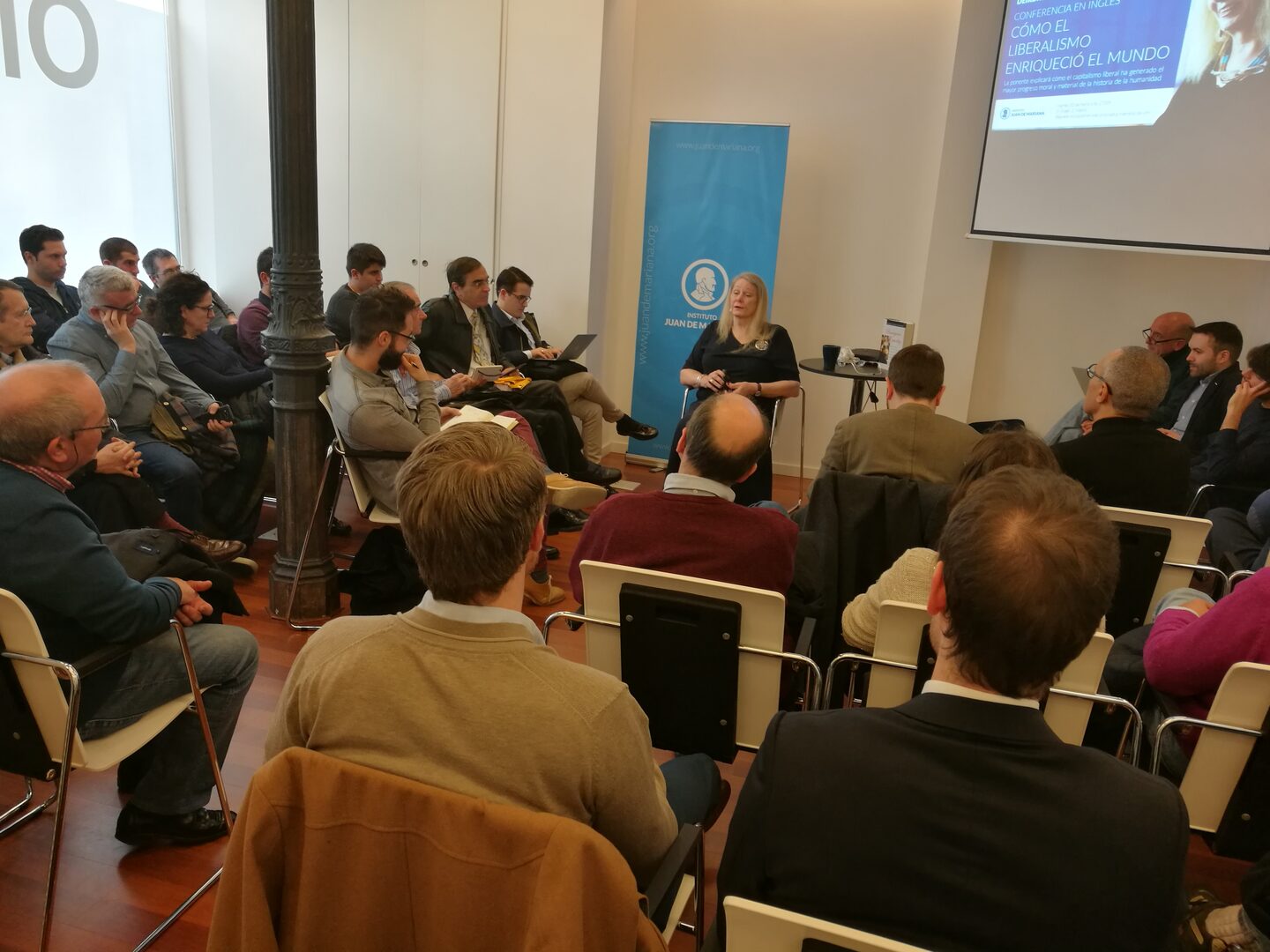 En opinión de la conferenciante, "Adam Smith ha hecho la gran pregunta de la economía. ¿Qué es lo que nos ha traído la riqueza de las naciones? Soy economista de la Escuela de Chicago. Me gustan los números, las curvas de oferta y demanda… Tengo simpatía por la Escuela Austriaca, me he acercado a ella en distintos puntos. Pero, en mi opinión, si queremos responder a la pregunta de Adam Smith, tenemos que estudiar todo tipo de teorías y pensar sobre las causas del progreso. ¿Son los ahorros la base de la riqueza, como afirma la derecha? ¿Se explica por el esfuerzo de los trabajadores, como dice la izquierda? ¿Se trata, entonces, de las instituciones, una tesis muy recurrente en las últimas décadas? No, la clave es otra, son las ideas que surgen en un contexto de libertad".