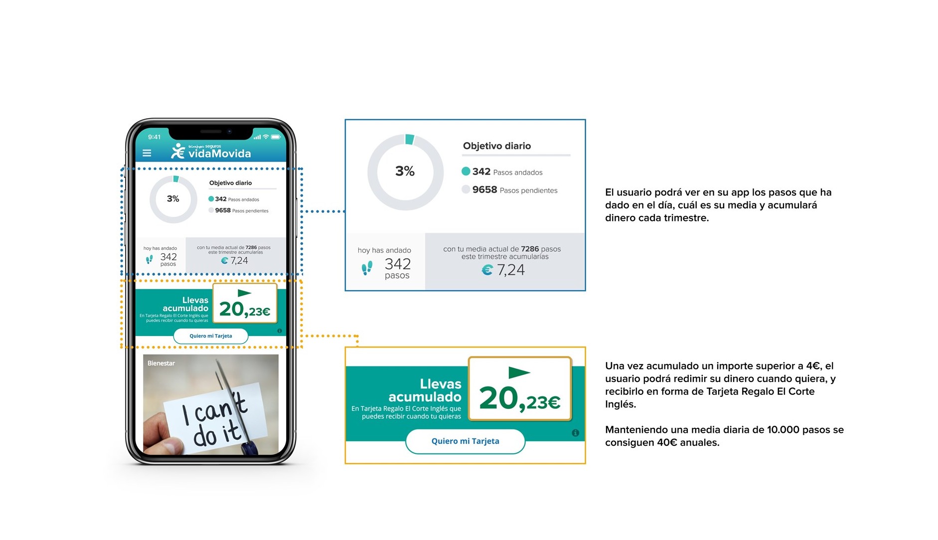 En concreto, el asegurado podrá acumular hasta 40 euros anuales, que se canjearán por una tarjeta regalo de El Corte Inglés, manteniendo una media de 10.000 pasos al día, que equivale a unos siete kilómetros al día o a una hora y 40 minutos, distancia recomendada por la Organización Mundial de la Salud (OMS) para garantizar una buena salud. Esta es la primera vez que un seguro de vida ofrece ventajas y recompensa por llevar una vida saludable.