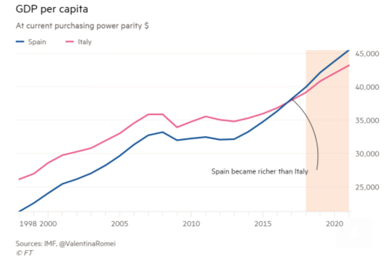 Por primera vez en la historia, España ha superado a Italia en términos de PIB per cápita. Así lo refleja la actualización de las estadísticas del Fondo Monetario Internacional (FMI), que ajusta los datos para tener en cuenta la capacidad adquisitiva. Este cálculo arroja un PIB per cápita de 31.126 euros en el caso de España, frente a los 31.000 euros del país transalpino.