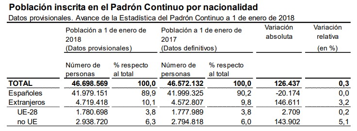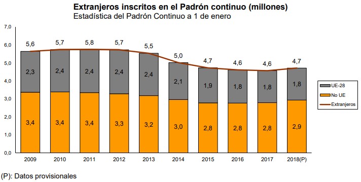 Desde el año 2000, el crecimiento demográfico se debió, fundamentalmente, a la inscripción de extranjeros, cuya cifra pasó de 923.879 a 5.751.487 a inicios de 2011. A partir de ese momento, su número comenzó a descender, siendo la mayor caída en 2013 (-522.751). Esta tendencia se mantuvo en los años siguientes, aunque en 2016 el saldo fue el de menor intensidad (-45.774). Sin embargo, el volumen de extranjeros vuelve a crecer en 2017, con un aumento de 146.611 personas, compensado así la caída registrada en la población nacional (-20.174). En la actualidad, el país cuenta con un total de 41.979.151 personas de nacionalidad española (89,9%) y 4.719.418 extranjeros (10,1%).