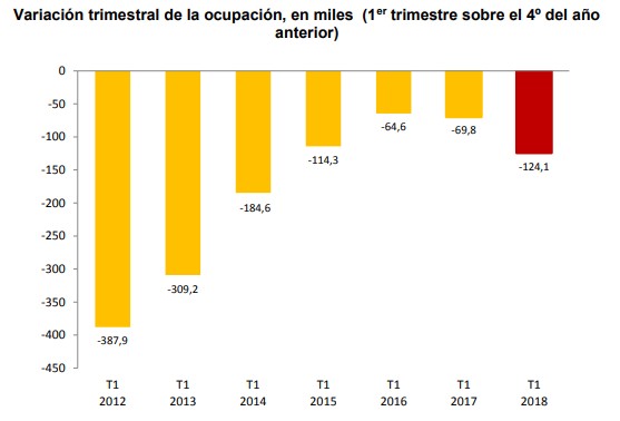 La buena marcha que venía registrando el mercado de trabajo tropezó en el primer trimestre, según refleja la última Encuesta de Población Activa (EPA), publicada este jueves. Entre enero y marzo se destruyeron 124.100 empleos, un 0,6% respecto al trimestre anterior, lo que situó el total de ocupados en 18.874.200 personas. Este recorte de puestos de trabajo es el más elevado en un primer trimestre desde 2014, cuando desaparecieron 184.600 empleos.