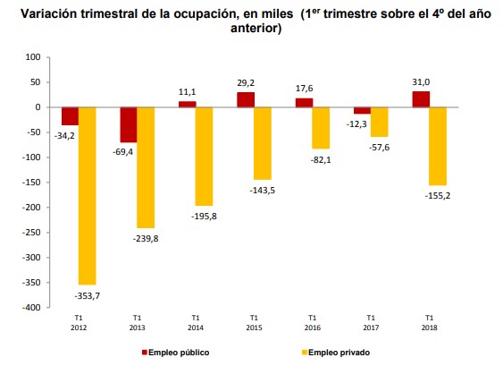La ocupación subió en la Agricultura (13.100 más) y la Construcción (8.200), pero bajó en los Servicios (-110.500) y la Industria (-34.900). Asimismo, el empleo privado descendió en 155.200 personas, situándose en un total de 15.768.400, mientras que el empleo público creció en 31.000, hasta 3.105.800, situándose apenas un 6% por debajo del récord registrado en 2011.