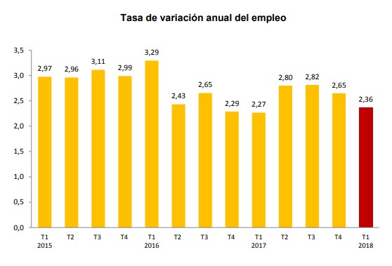 Igualmente, se desaceleró la creación de empleo a nivel interanual. Así, en los 12 últimos meses, la economía nacional generó 435.900 nuevos puestos de trabajo, lo que supone un avance interanual del 2,36%, 29 centésimas menos que el trimestre previo.