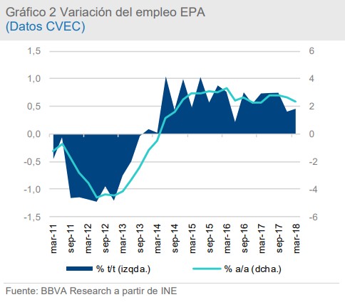 Pese a ello, es preciso eliminar el efecto calendario para poder analizar la evolución del mercado de trabajo en términos homogéneos, ya que la Semana Santa cayó este año en marzo. De este modo, una vez descontada la estacionalidad, las estimaciones del INE indican que el crecimiento de la ocupación se estabilizó en el 0,5% intertrimestral. Es decir, España siguió creando empleo entre enero y marzo, pero a un ritmo inferior al previsto inicialmente, según advierte BBVA Research.