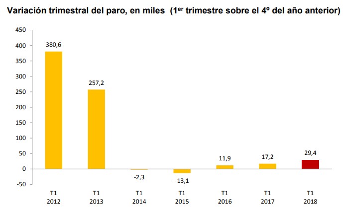 Se trata de la subida del desempleo más elevada en un primer trimestre desde el año 2013, cuando subió en más de 257.200 personas. En los primeros trimestres de 2016 y 2017 se registraron incrementos del desempleo de 11.900 y 17.200 personas, respectivamente, mientras que en 2014 y 2015 hubo descensos de 2.300 y 13.100 parados.