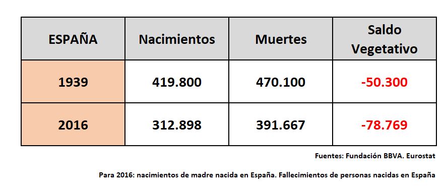 Pues bien, esta semana Eurostat publicaba sus cifras de fallecidos en los diferentes países europeos. Cruzándolas con las de nacimientos obtenemos un dato terrible: si sólo contamos a los nacidos en España (tanto para los nacimientos como para las muertes) el saldo vegetativo en 2016 fue de -78.769 personas cuando en 1939 ascendió a -50.300 personas (cifras del libro de BBVA Research Estadísticas históricas de España, siglos XIX-XX).