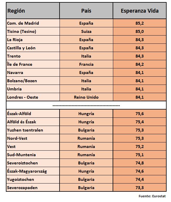 En la siguiente tabla se encuentran reunidas las regiones europeas con mayor y menor esperanza de vida para los niños nacidos en esas regiones en 2016, unos datos publicados hace unos días en Eurostat, según explica Alejandro Macarrón, experto en cuestiones demográficas y autor del libro Suicidio demográfico en Occidente y medio mundo: ¿A la catástrofe por la baja natalidad?.
