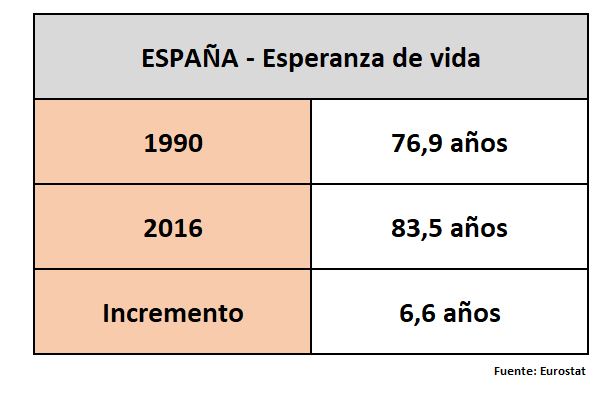 Aunque seguimos avanzando también en lo que hace referencia a la mortalidad infantil, las cifras ya son tan bajas que las pequeñas mejoras ya no tienen apenas impacto en la estadística. Ahora mismo la esperanza de vida crece porque nuestros ancianos cada vez viven más (y, por cierto, también con mejor calidad). De esta manera, en el último cuarto de siglo, un período de tiempo corto, la esperanza de vida se ha incrementado en 6,6 años: Y eso que partíamos de unos excelentes, en términos históricos, 77 años de esperanza de vida en 1990.