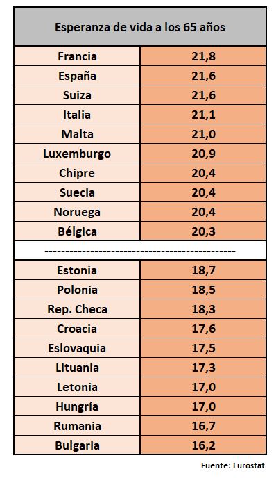 La consecuencia es que a los 65 años, la edad de jubilación, un español medio tiene más de dos décadas de vida por delante. Otro dato excelente y del que a veces no somos conscientes de su significado. También en esto nos situamos a la cabeza de Europa. Disputándonos el primer puesto de la tabla con franceses, suizos o italianos. Países mucho más ricos, como Suecia, Noruega o Alemania están a uno-dos años de los niveles habituales en España.