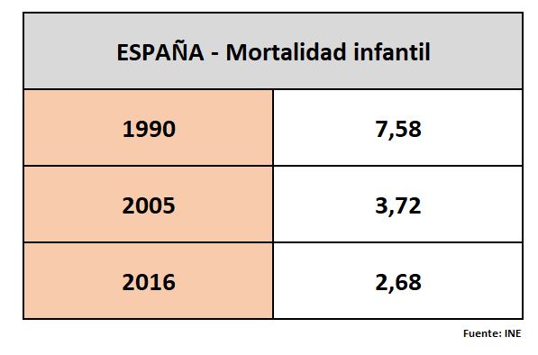 También es cierto que, como decíamos antes, en esta cuestión las estadísticas de casi todos los países son excelentes. Las diferencias son pequeñas. Pero incluso así, estar en las primeras posiciones es un motivo de alegría. Con un añadido: como vemos en la siguiente tabla, incluso aunque décadas que llegamos a cifras de mortalidad infantil muy bajas (menos de 10 muertes antes del año de vida por cada mil nacimientos), seguimos mejorando las cifras, poco a poco, casi cada año.