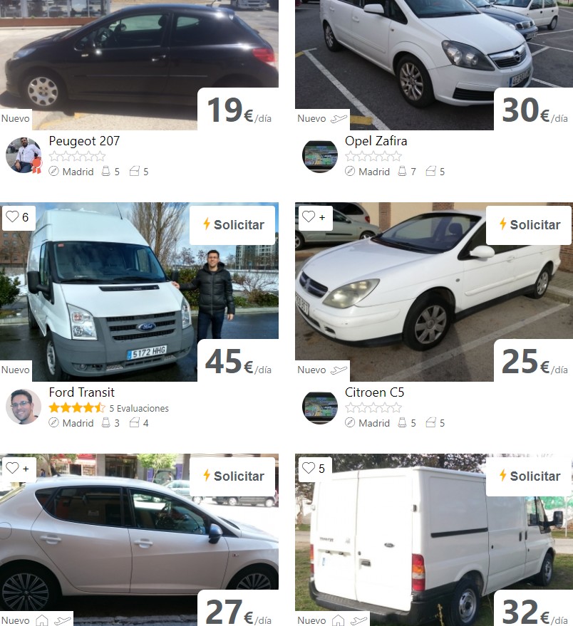 Tal y como se ve en la siguiente imagen, los coches disponibles aparecen en Amovens como si de un catálogo se tratara. Algunos tienen muchas fotos, otros, solo una; algunos conductores ponen sus condiciones como prohibir fumar o no admitir mascotas. El precio del alquiler ronda los 30 euros el día y ya tienen 10.000 vehículos publicados.