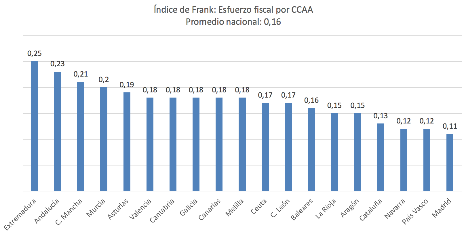 El mayor esfuerzo fiscal de nuestro Estado Autonómico está en Extremadura, donde el Índice de Frank arroja una nota de 0,25, muy por encima del promedio del 0,16 que se estima para el conjunto del país. Igualmente preocupante es el 0,23 de Andalucía, que ocupa el segundo puesto, o el 0,21 y el 0,20 de Castilla-La Mancha y Murcia, tercera y cuarta en la clasificación. Por debajo de estos registros, pero por encima del promedio nacional, aparecen Asturias (0,19), Valencia (0,18), Cantabria (0,18), Galicia (0,18), Canarias (0,18), Melilla (0,18), Ceuta (0,17), Castilla y León (0,17) y Baleares (0,16).