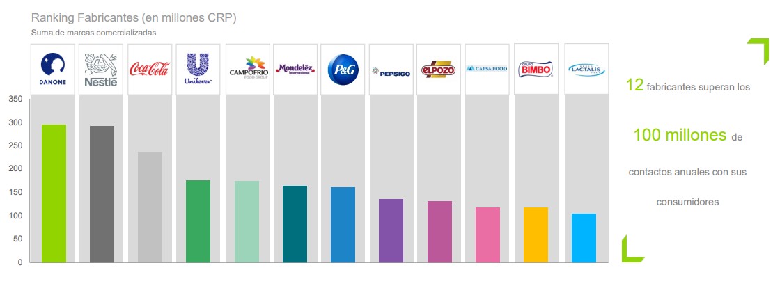 Desde el punto de vista de fabricantes, hay 12 compañías lideradas por Danone y Nestlé que se reparten la mayor parte del pastel. Grupo Bimbo, tras la compra del negocio de bollería de Panrico, se incorpora a los fabricantes que superan los 100 millones de contactos con sus consumidores.