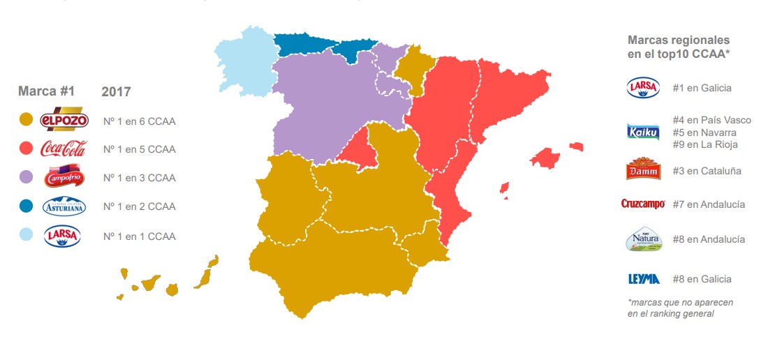 El estudio revela que el producto local triunfa en el supermercado. De las 50 marcas más populares entre los lineales de las tiendas españolas, un total de 27 son de origen nacional. En un mapa repartido entre 5 marcas, Larsa se convierte por primera vez en la marca más elegida en Galicia, y Central Lechera Asturiana, además de su comunidad de origen, lidera también en Cantabria. El resto de Comunidades Autónomas siguen dominadas por las mismas marcas.