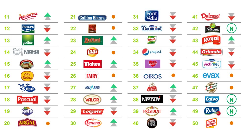 En la siguiente tabla se puede ver el resto del Top 50. Debido a la incorporación en su portfolio de las referencias de La Cocinera, Buitoni (+36,5%), destaca como la marca que más han crecido, seguida de la palentina Gullón (20,7%), impulsada por su mayor presencia en supermercados como Lidl o Mercadona. Tres enseñas nuevas en la lista de 2017 son Florette, Calvo y Roler.