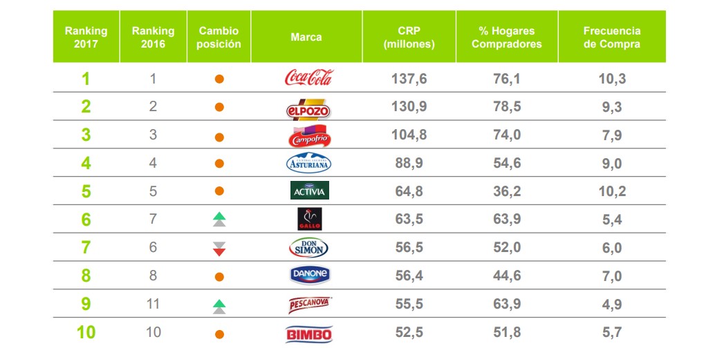 Central Lechera Asturiana y Activia completan el Top 5. Este año, la gallega Pescanova logra meterse en los 10 primeros puestos este año. Los responsables del informe lo achacan a la inversión en publicidad y a los nuevos lanzamientos, como los platos preparados o los productos sin sal.