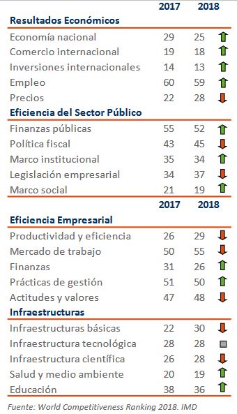 El estudio analiza cuatro áreas principales: resultados económicos, eficiencia del Gobierno, eficiencia empresarial e Infraestructuras. La mejor posición es la anotada en infraestructuras y la peor en eficiencia empresarial. Sobre resultados económicos -donde el país ha subido cuatro posiciones- destaca la mejora en la formación bruta de capital fijo y el descenso del paro. Sin embargo, ha empeorado la inflación y la balanza por cuenta corriente respecto a 2017. En este mismo apartado, el WCR señala como fortalezas de la economía nacional la exportación, la inversión directa en el exterior y la inversión extranjera en España.