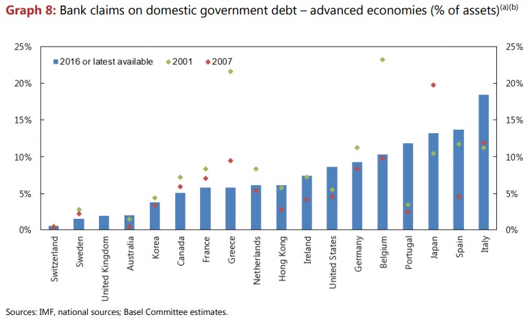 Y el problema aquí, al igual que sucede con cualquier otro crédito susceptible de resultar impagado, es que los bancos sufrirán en mayor o menor medida en función de su exposición a dichos activos. Según un reciente informe del Banco Internacional de Pagos, la deuda pública de Italia representa casi el 20% de los balances de la banca del país, el nivel más alto de las economías desarrolladas.