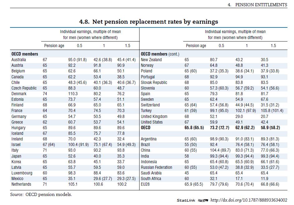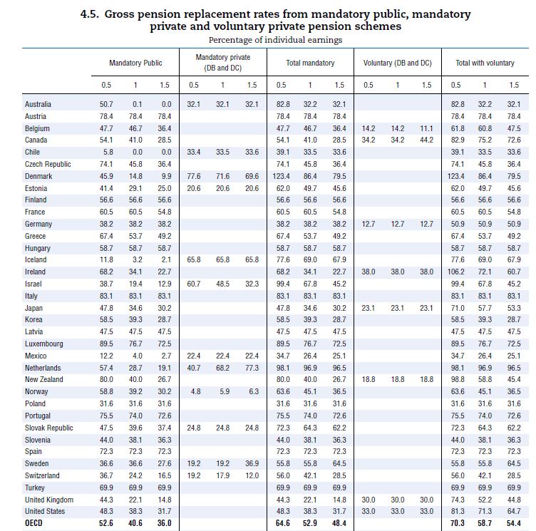 Pues bien, como vemos, España tiene una de las tasas de sustitución más elevadas de la OCDE: por encima del 80% en términos netos para un trabajador que cobre el salario medio de la economía. De hecho, la primera tabla incluso puede ser un poco engañosa para un lector español que piense que todos los modelos son como el vigente en nuestro país. En esta primera tabla España está bien situada pero tampoco destaca tanto.