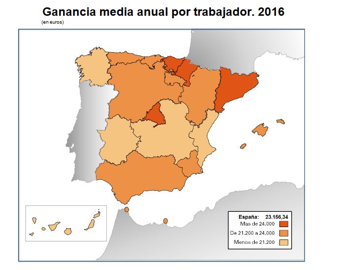 Por comunidades autónomas, el País Vasco, la Comunidad de Madrid y Navarra son las regiones con los salarios más altos; en cuarto lugar, y también por encima de la media nacional, se encuentra Cataluña; mientras que el resto de autonomías se sitúan todas por debajo de la media; los extremeños y los canarios son los únicos que no superan los 20.000 euros anuales.