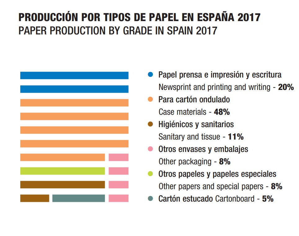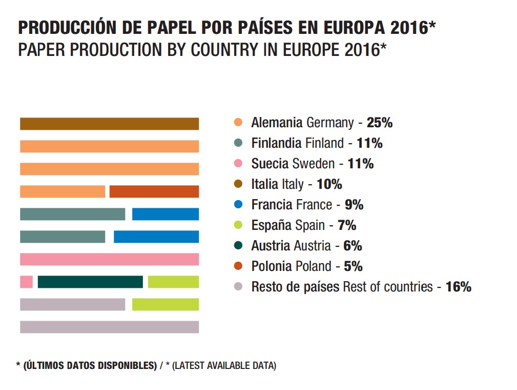La industria papelera española es un sector fuertemente inversor, que exporta más de la mitad de su producción (el 57% de la celulosa y el 43% del papel en 2017) desde sus 10 fábricas de celulosa y sus 68 fábricas de papel. En 2017, las fábricas que están repartidas por todo el país produjeron 6.217.800 toneladas de papel, una cifra similar a la del año anterior. Con un 7% de la producción total europea, nuestro país es el sexto productor de papel de la UE, tras Alemania, Finlandia, Suecia, Italia y Francia.