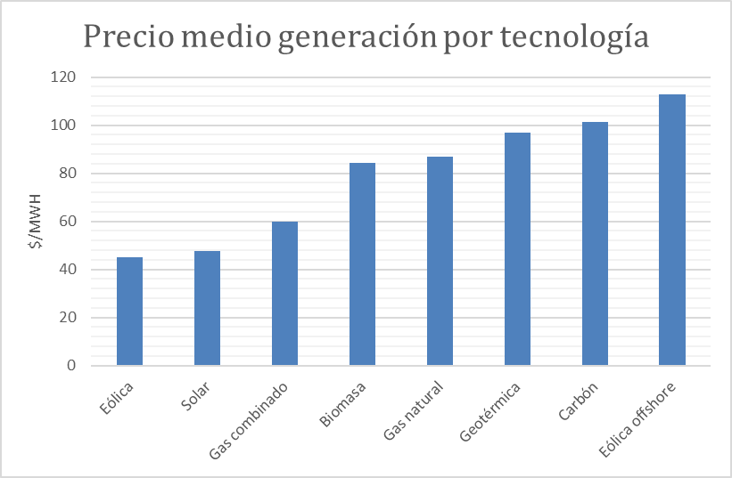 La agencia internacional de la energía calcula el coste de generar energía con centrales que se empiecen a construir hoy y estén disponibles en 2022. En el siguiente gráfico se refleja el precio de la electricidad generado con diferentes tecnologías.