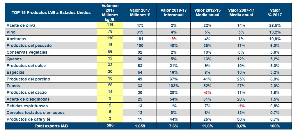 La aceitunas, el aceite de oliva, el vino o las conservas son los productos que más exporta España a EEUU. "Les puede pasar a todos", advirtió el director general de FIAB. En la siguiente tabla se observa el ranking, en volumen y en valor, de las exportaciones de nuestro país, con destino al país americano.