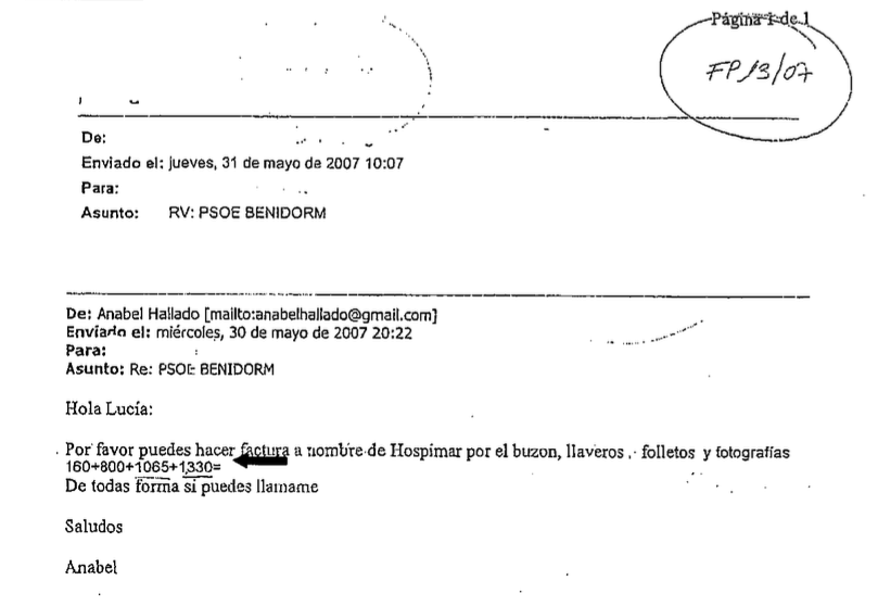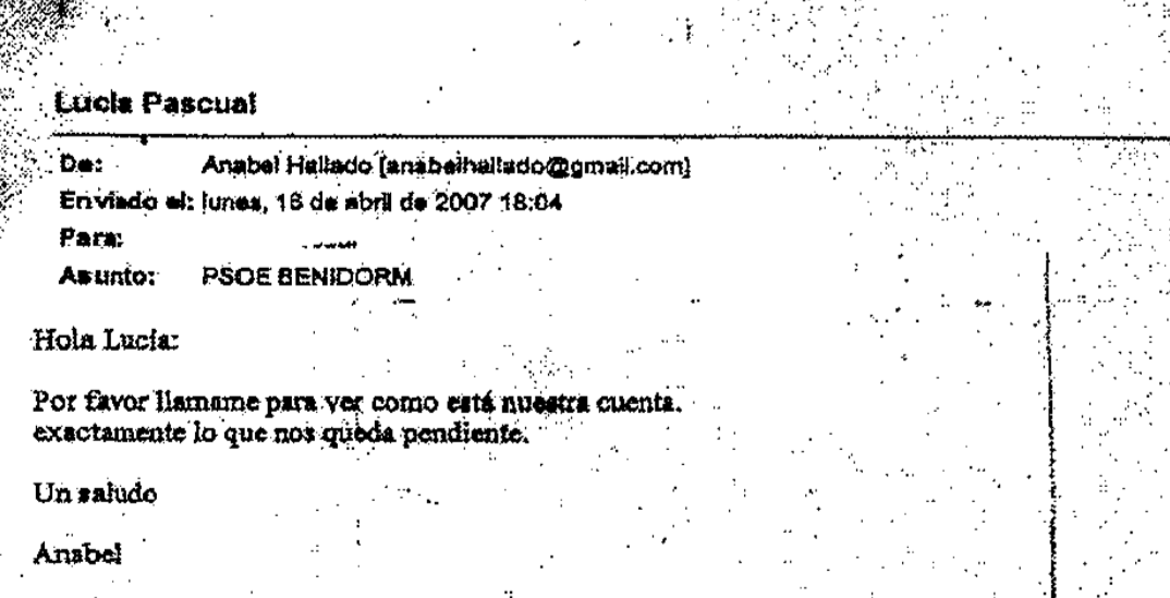 Según el informe policial, "en el correo que antecede se observa cómo, en fecha 16 de abril de 2007, la secretaria de organización del PSOE de Benidorm, Anabel Hallado, contactó con Lucía Pascual, apoderada de la empresa CRESPO GOMAR SL, para interesarse por el estado de la cuenta del PSOE de Benidorm con dicha compañía y conocer los pagos que quedaban pendientes".