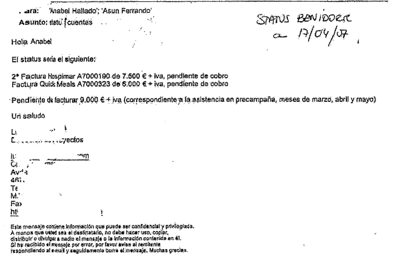 Pero, por si todo lo anterior no fuese suficiente, la UDEF también recoge en su dossier "la existencia de otra fotocopia de un correo electrónico en el que Anabel solicita a Lucía que haga las facturas correspondientes a nombre de Hospimar".