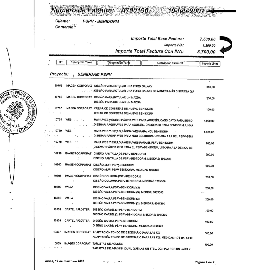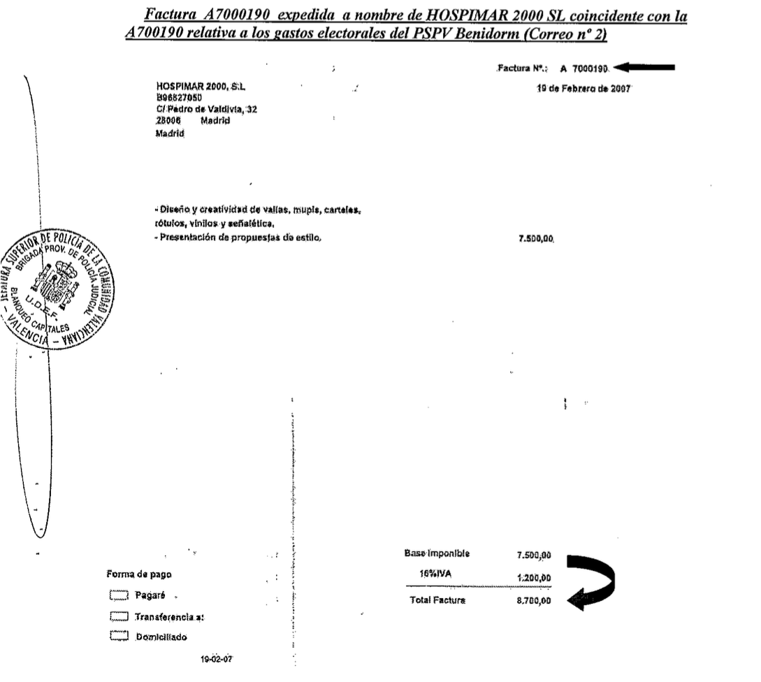 Cruzando la contabilidad de las distintas organizaciones implicadas, las autoridades encontraron facturas coincidentes. Lo vemos, por ejemplo, en este recibo expedido a nombre de HOSPIMAR, pero ajustado a un monto coincidente con los gastos electorales del PSOE-PSPV de Benidorm.