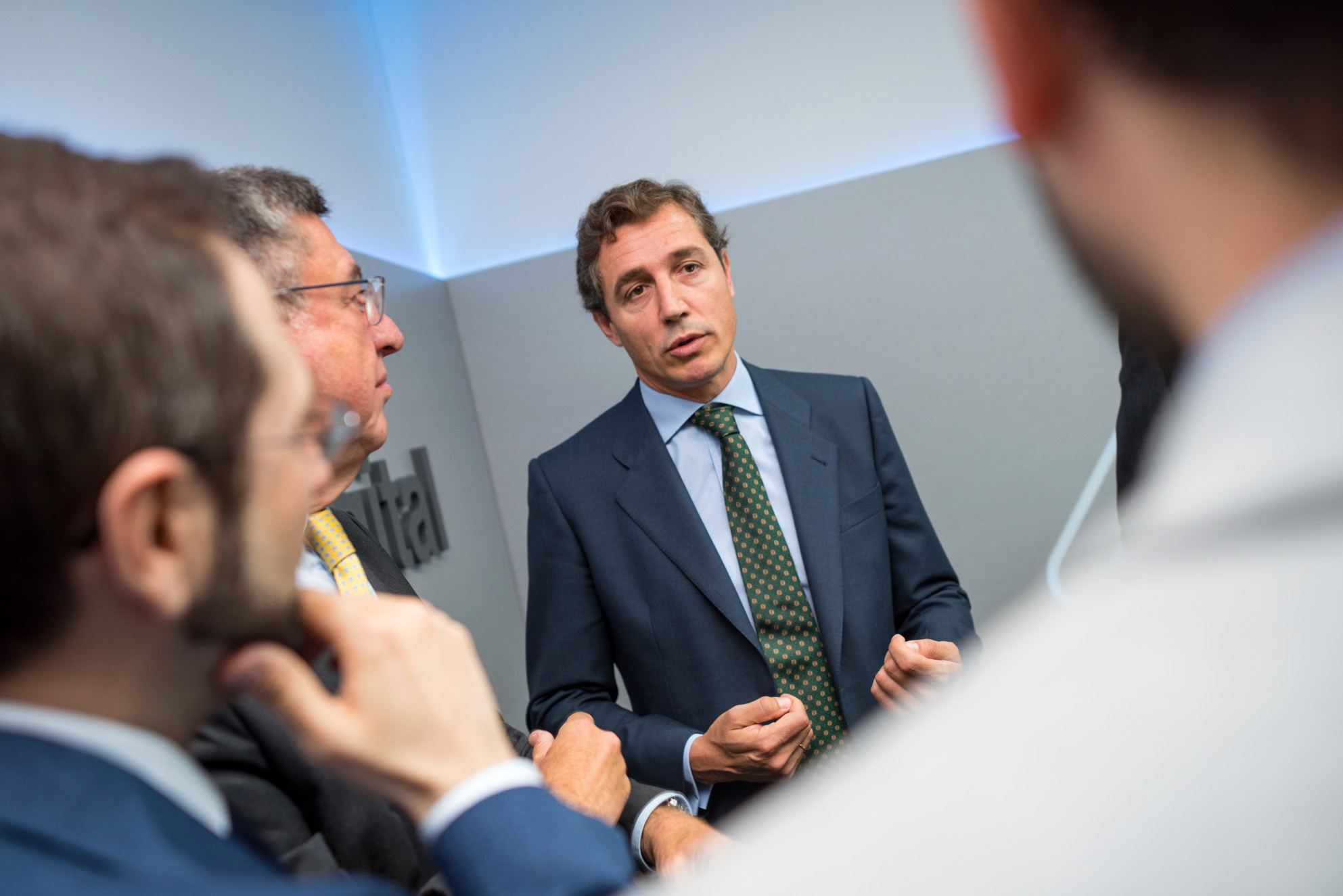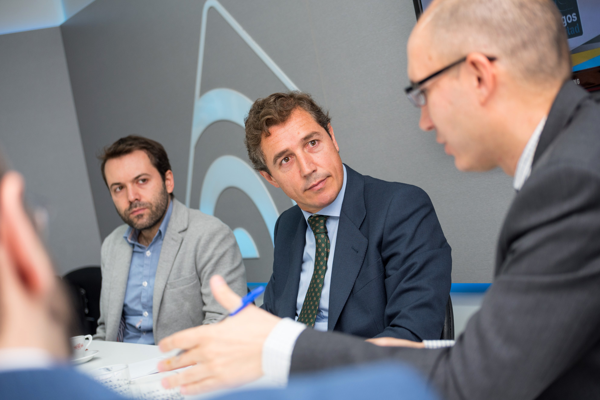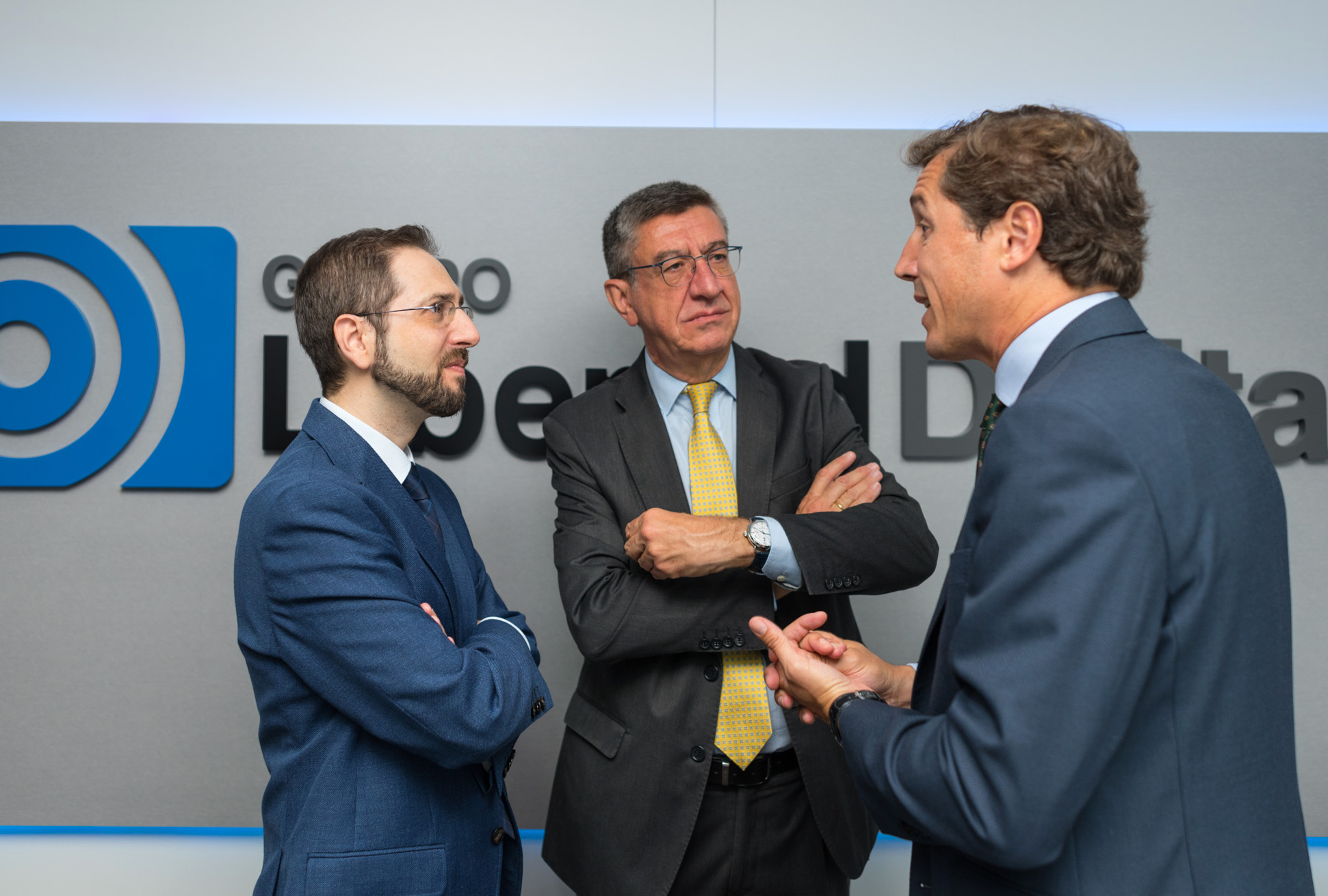El socio director de inversiones de azValor, Fernando Bernad (i) charla con Juan Ramón Rallo (c), director del Instituto Juan de Mariana y colaborador de esRadio y con Manuel Llamas, jefe de Economía de Libertad Digital y esRadio minutos antes de que comenzara el desayuno informativo de Diálogos en Libertad: Alternativas de inversión V: Value investing y cultura financiera.