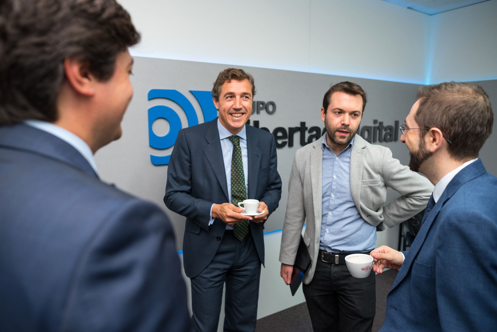 Fernando Bernad, socio director de azValor y Juan Ramón Rallo, director del Instituto Juan de Mariana charlan con Manuel Llamas mientras degustan un fabuloso café fresco y recién tostado de La Mexicana en los minutos previos al desayuno informativo sobre Value Investing y cultura financiera que se ha celebrado este jueves en Libertad Digital