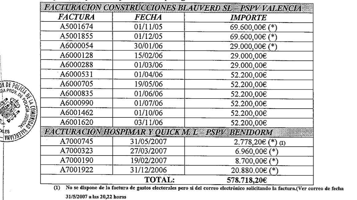 El dossier remitido por las autoridades al juzgado n. 21 de Valencia recoge numerosas facturas que corresponderían a la presunta trama. Las dos primeras se habrían cerrado en noviembre y diciembre de 2015, a razón de 69.600 euros cada una. De enero a marzo de 2016, la UDEF cree haber identificado tres facturas falsas, todas ellas por un monto de 29.000 euros. Finalmente, entre abril y noviembre de 2006, la policía encuentra seis pagos más, todos a razón de 52.200 euros.