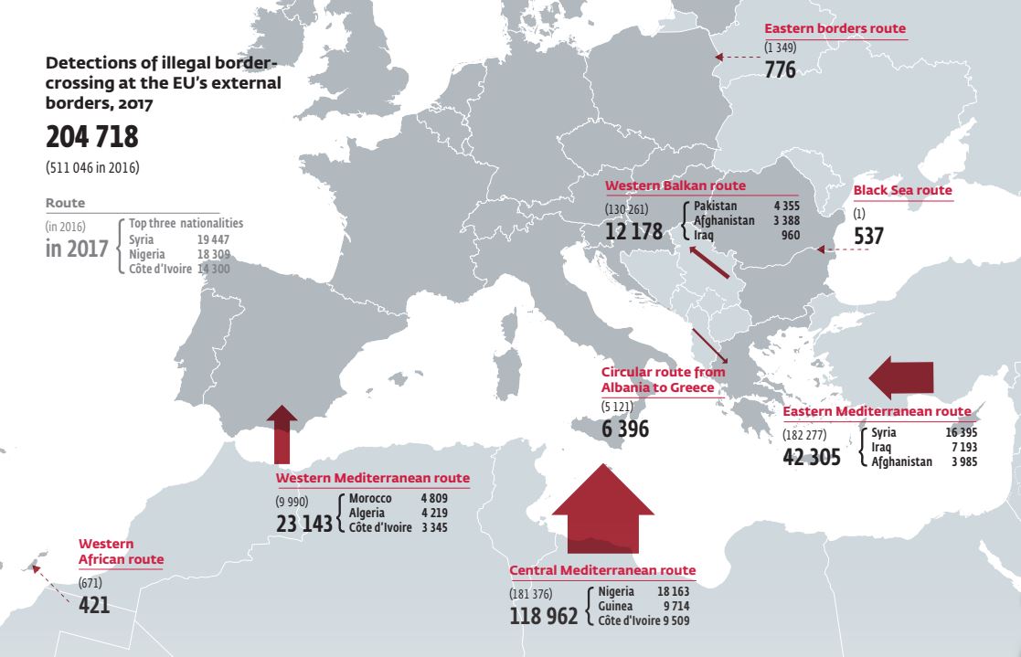 - 204.719 personas intentaron entrar en el continente de forma ilegal y fueron detenidos (es un 60% menos que en 2016, cuando más de medio millón de personas fueron interceptadas en las fronteras europeas)