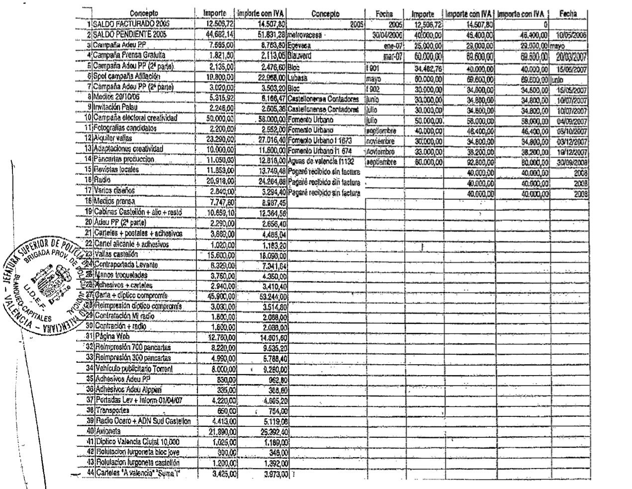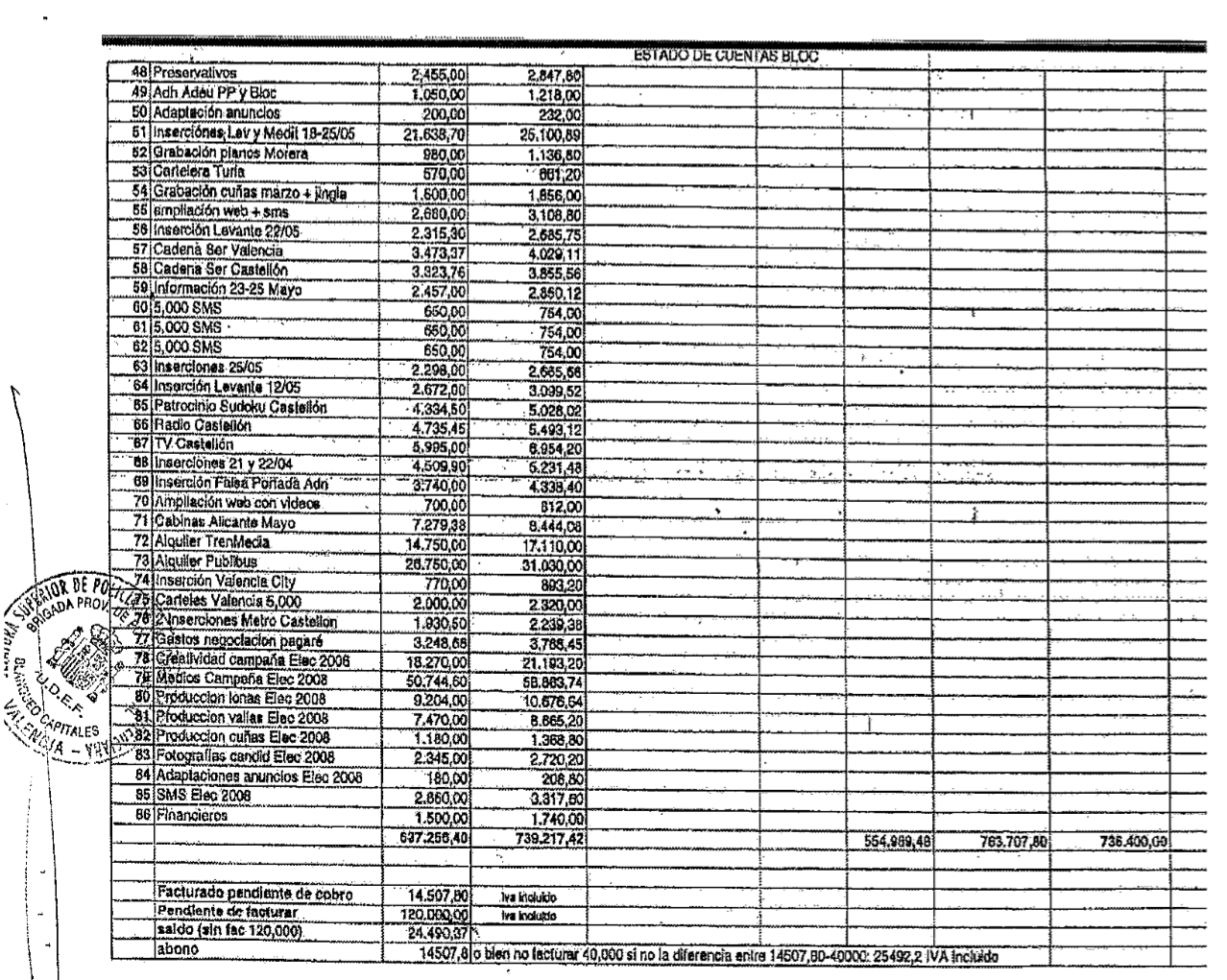 Tras repasar la contabilidad de CRESPO GOMAR, la policía concluyó que "la presunta financiación irregular no solo podría haberse producido en el Partido Socialista, sino que también puede deducirse un funcionamiento similar entre la empresa y el partido político BLOC-COMPROMÍS". El siguiente cuadro recoge la contabilidad de distintos gastos de campaña reconocidos por dicha formación: