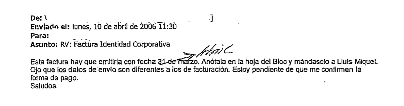 Un ejemplo de los vínculos entre las partes implicadas lo tenemos en el hilo de correos electrónicos que, a lo largo del mes de abril de 2006, tramitó una factura que fue remitida a Metrovacesa, pero quedó "anotada en la hoja del Bloc". De hecho, en el correo incautado por la policía se habla de la importancia de remitir la factura en cuestión a Lluis Miguel, a quien los agentes identifican "con toda probabilidad" como Lluis Miquel Campos Sanchís, secretario de comunicación y acción electoral de Bloc-Compromís.