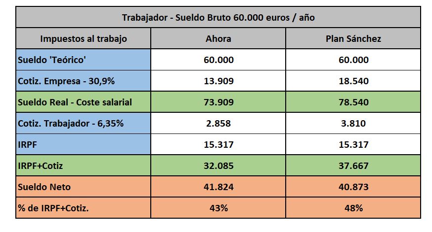 - Incluso en el mejor supuesto para el empleado (la empresa asume al 100% el recargo de Sánchez) este incremento del sueldo real bruto no sólo no se traducirá en un incremento de su neto (lo que le llega al banco) sino que cobrará 1.000 euros menos, los que se derivan del aumento en las cotizaciones sociales a cargo del trabajador. Aquí queda una duda: el presidente del Gobierno no ha aclarado si el destope será total o sólo de la parte que se atribuye a la empresa (sería un movimiento muy típico de los políticos españoles: disparar el coste laboral real pero que se intentaría vender como una subida de impuestos a las empresas que no afecta a los empleados).