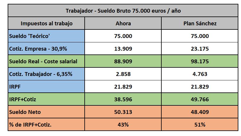 - 75.000 euros brutos al año: con este salario bruto se cruza la frontera. Si Pedro Sánchez cumple con su promesa hecha en TVE, un trabajador que cobre por encima de esta cantidad le dejará al Estado más de la mitad de su coste laboral real antes de salir de su oficina. Es decir, sólo con lo que pagaría de IRPF y cotizaciones sociales, ya estará por encima del 50% de presión fiscal. Y a eso habría que añadir todos los demás impuestos que deberá pagar: IVA, Especiales, Tasas…