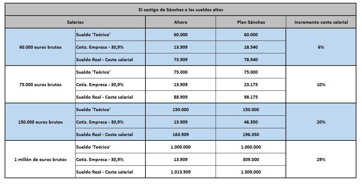 - Costes salariales y competitividad: un empleado que ahora mismo cobra 75.000 euros brutos le cuesta a su empresa casi 89.000 euros en coste salarial total, una vez que se añaden las cotizaciones a la Seguridad Social. Con la propuesta de Sánchez, esa cifra subiría hasta los 98.175 euros. ¿Quién los pagará? Como apuntábamos, todos los políticos españoles que han hecho propuestas parecidas han señalado a las empresas, como si sólo el empleador fuera a asumir ese palo fiscal.
