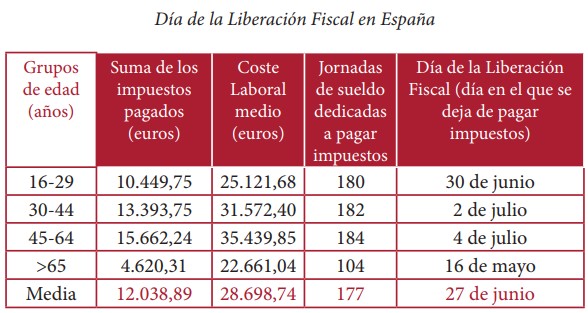 Este miércoles, 27 de junio, es el Día de la Liberación Fiscal en España, lo cual significa que los contribuyentes han dedicado una media de 177 días al pago de impuestos en 2018, un día menos que el pasado año, según el informe elaborado por el think tank Civismo. Esta estimación incluye el coste del IRPF, cotizaciones sociales e IVA, así como el impacto medio de gravámenes como el IBI, Impuestos Especiales, Patrimonio o el de matriculación, entre otros.