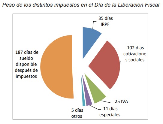 En concreto, el pago de las cotizaciones a la Seguridad Social supone, de media, 102 jornadas de salario; a las que hay que añadir otras 35 por IRPF, hasta 25 por IVA, 11 por Impuestos Especiales y 5 más por otros tributos estatales, autonómicos y municipales como el IBI, Patrimonio, Sucesiones o Matriculación. Esto deja disponibles 187 días de sueldo libres para el contribuyente.