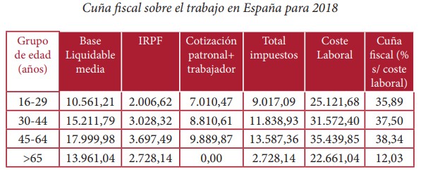 Tal y como refleja la siguiente tabla, la suma de los impuestos pagados asciende a algo más de 12.000 euros al año para un trabajador medio, cuyo coste laboral (incluyendo las cotizaciones que paga la empresa) ronda los 28.700 euros. Las cifras varían en función de la edad del contribuyente, debido a las diferentes circunstancias relacionadas con su vida laboral (los jubilados, por ejemplo, pagan menos impuestos, ya que no abonan cotizaciones).