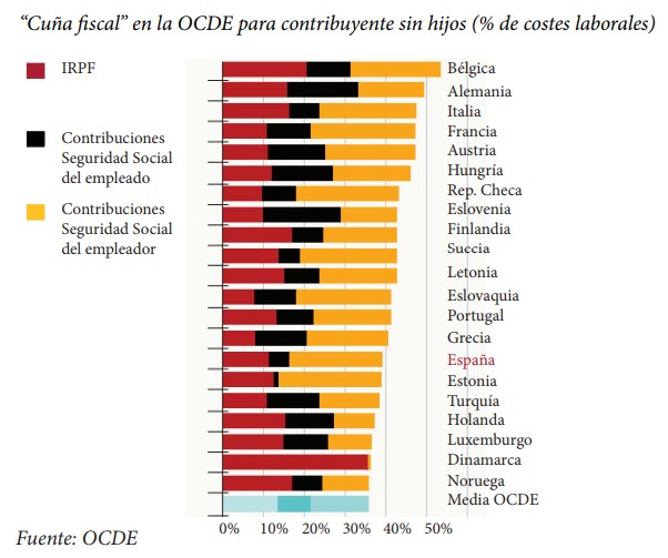 La "cuña fiscal" que soporta el contribuyente español se sitúa entre las más altas de los países desarrollados, según el informe Taxing Wages que publica la OCDE. Esta carga sobre el trabajo asciende al 38,34% en 2016, frente al 35,9% del promedio de la OCDE, lo que supone un 6,8% más que el conjunto de las economías ricas. Asimismo, para el contribuyente con dos hijos, esta "cuña" se reduce en España hasta el 33,9%, frente al 26,1% de la media de la OCDE.