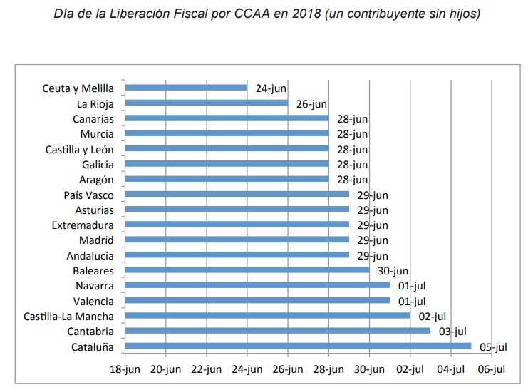 Teniendo en cuenta estos cambios menores, se observa que la mayor carga fiscal corresponde a Cataluña, donde el contribuyente medio (sin hijos) está obligado a trabajar hasta el 5 de julio para cumplir con el Fisco, seguida de Cantabria y Castilla-La Mancha. Por el contrario, Ceuta y Melilla, La Rioja y Canarias son las regiones que más adelantan su Día de la Liberación Fiscal