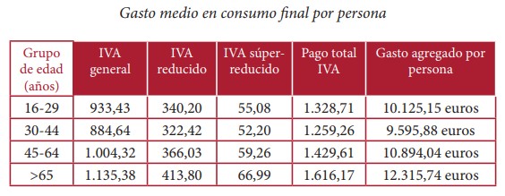 Para calcularlo, el estudio toma como referencia el gasto medio de los hogares: 21.233 euros para el tramo de 16-29 años; 26.269 para 30-44;, 31.000 para 45-64 años; y 23.473 euros para mayores de 65 años. El 43,9% del gasto familiar está sujeto al tipo general del 21%, mientras que el 33,6% lleva la imposición del 10%, el 13,6% la del 4% y el 8,9% restante corresponde a gastos que están exentos de IVA.