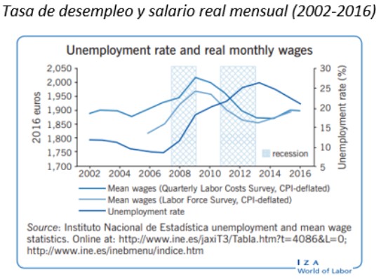 La evolución salarial ha sido dispar durante la crisis, ya que en una primera etapa, hasta 2009 y, en parte, 2010 y 2011, los salarios siguieron subiendo ajenos a la intensa destrucción laboral. Como indica Daniel Lacalle en su libro Acabemos con el paro: "Entre los años 2007 y 2011, casi 3.5 millones de ocupados perdieron su empleo. Mientras, los incrementos salariales pactados en convenios colectivos alcanzaron una media del 2,9% en el periodo 2007-2011". Todo un despropósito.