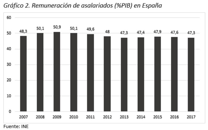 El peso de la remuneración de los asalariados en el PIB llegó a subir al 51% en 2009 para comenzar a caer en 2010 y tocar suelo en 2013, hasta el 47,3% del PIB. Desde finales de 2013 y hasta ahora, este indicador muestra una estabilidad que viene determinada por la evolución favorable del empleo. Pese a lo que dicen algunos, los salarios sobre el PIB no han caído mucho desde la reforma laboral y, de hecho, pese a bajar en 2017, el resultado ha sido el mismo que en 2013. En definitiva, el peso de las rentas salariales sobre el PIB ha caído poco más del 2% durante el Gobierno de Rajoy, concentrándose dicha reducción en los años 2012 y 2013.